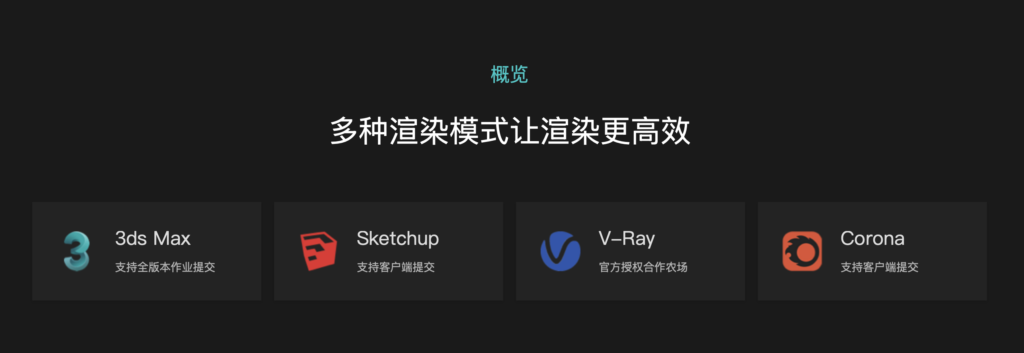 蓝海创意云渲染支持3ds Max、SketchUp、Blender等主流建模软件,兼容V-Ray、Corona等渲染引擎,确保复杂材质与灯光效果得到完美呈现。